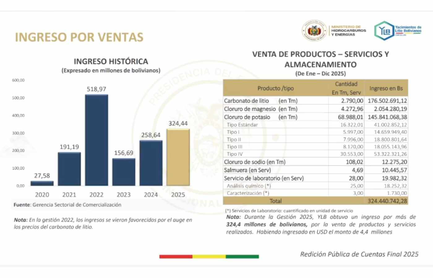 El presidente ejecutivo de Yacimientos de Litio Bolivianos (YLB), Sergio Soliz Gómez, informó que la estatal generó ventas de más de Bs 324 millones (unos USD 46.8 millones, TC 24/03/2026) por la comercialización de carbonato de litio y cloruro de potasio, a los mercados nacional e internacional, durante la gestión 2025.